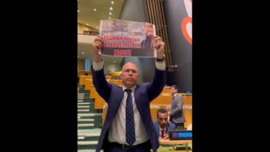 مندوب إسرائيل لدى الأمم المتحدة يحتج ضد كلمة رئيسي ويرفع صورة لمهسا أميني