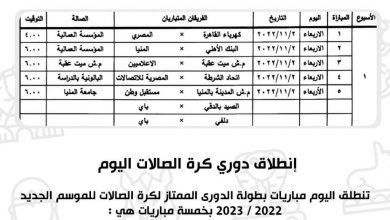 —————————— بوابة “مصر الآن” | متابعات تنطلق اليوم مباريات بطولة الدورى الممتاز لكرة الصالات للموسم الجديد ٢٠٢٢ / ٢٠٢٣، حيث…