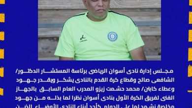—————————— بوابة “مصر الآن” | متابعات وجه مجلس إدارة نادي أسوان، برئاسة الشافعي صالح، الشكر للمدرب العام السابق للفريق محمد…