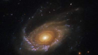 Large spiral galaxy at center. Its core surrounded by concentric rings of dark and light dust. Its spiral arms hold…