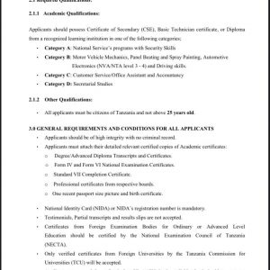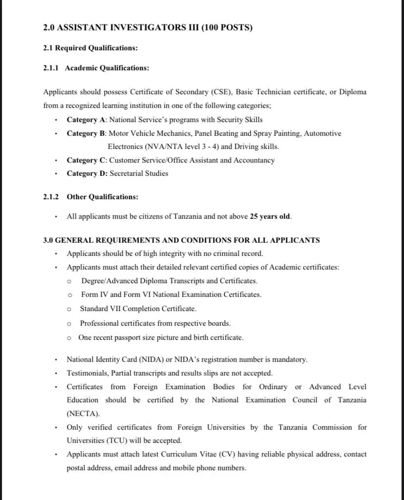 Kwa upande wa wapelelezi wasaidizi daraja la tatu, wanaohitajika ni waliohitimu elimu ya sekondari na mafunzo yoyote yanayotambulika ikiwemo ya ufundi kutoka katika taasisi zinazotambulika.