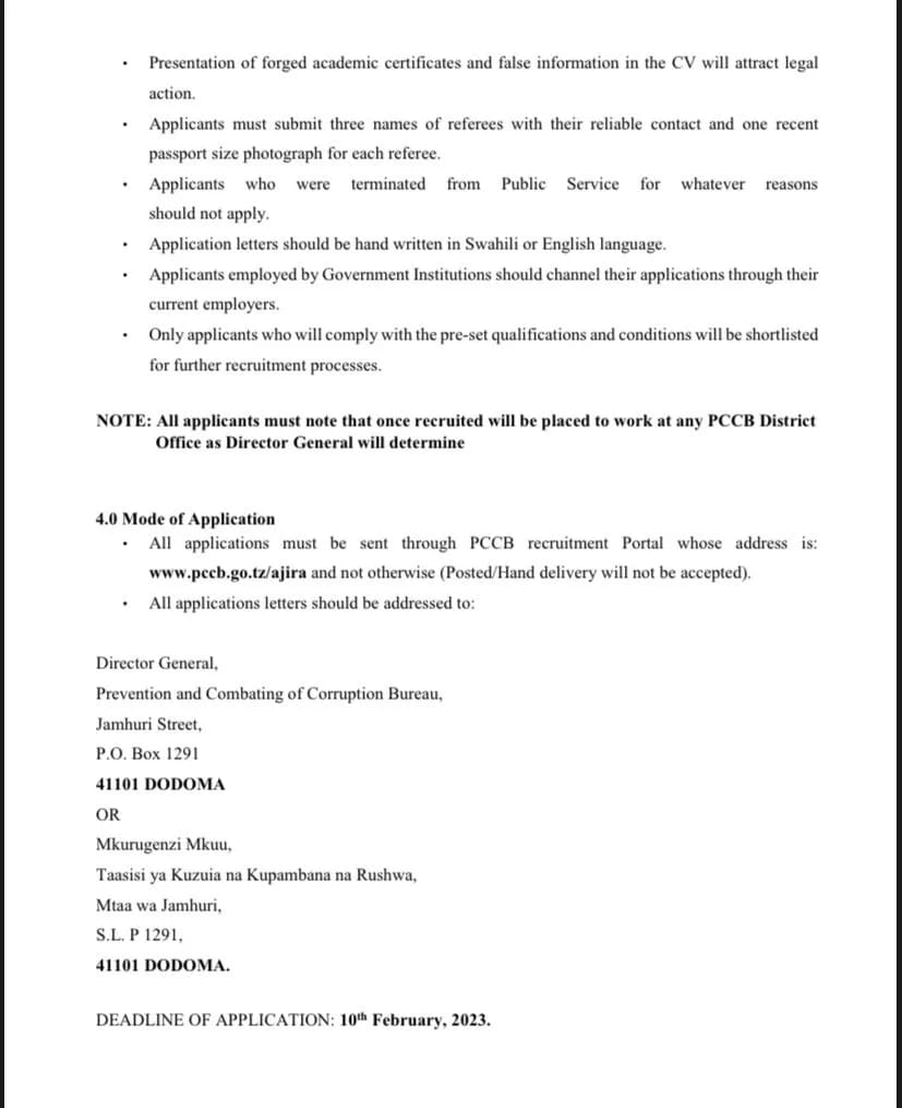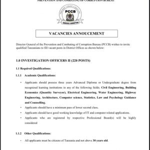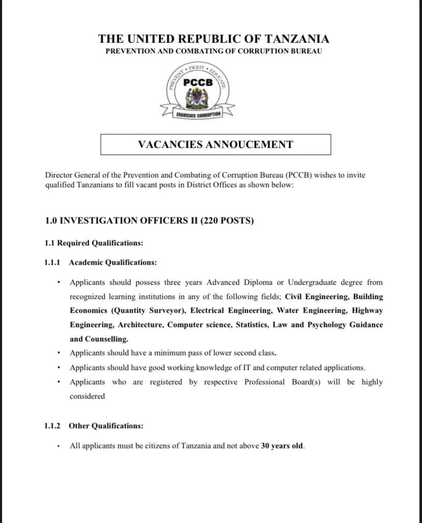 Kwa mujibu wa taarifa iliyotolewa na Takukuru leo Jumamosi, Januari 21, 2023, waombaji wa nafasi ya maofisa upelelezi wanatakiwa kuwa na Astashahada au shahada ya kwanza katika kozi ya uhandisi, usanifu, sayansi ya kompyuta, sheria na saikolojia.