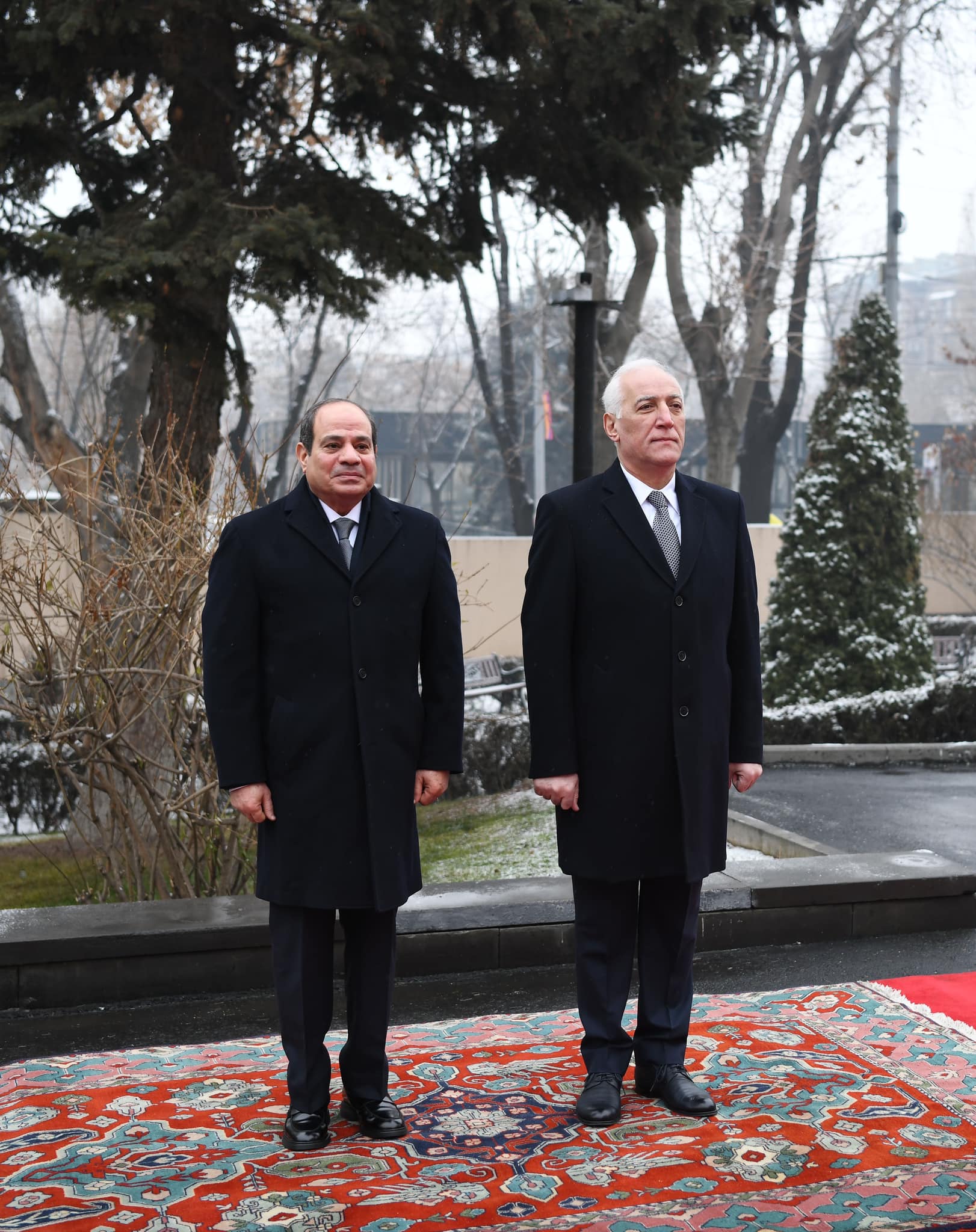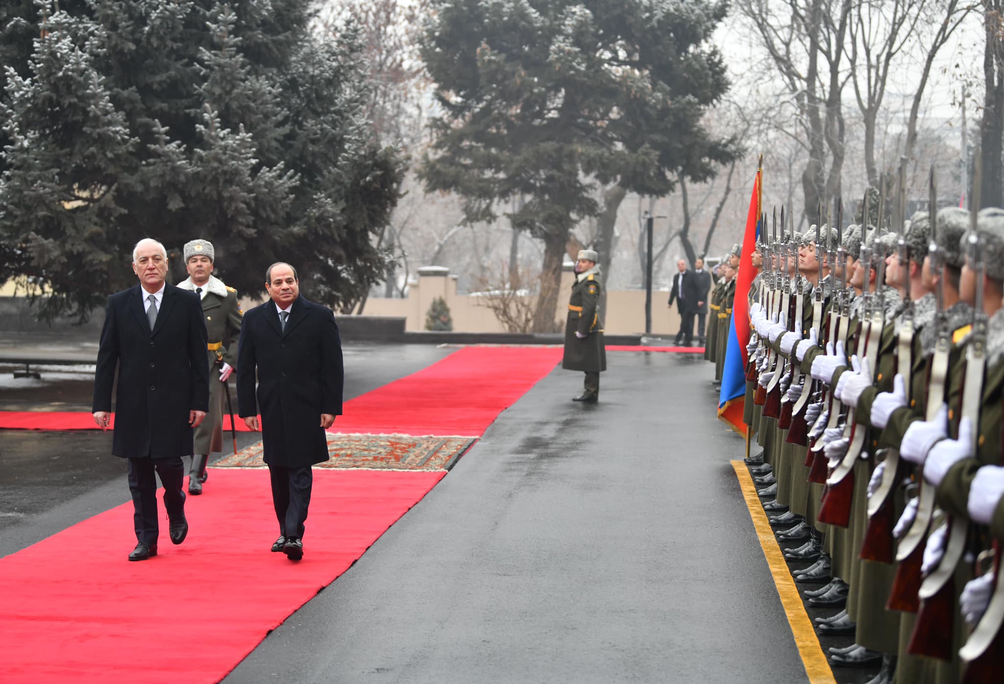 Mheshimiwa Rais Abdel Fattah El-Sisi leo, kwenye Ikulu,huko Mji Mkuu wa Armenia Yerevan, alikutana na Rais “Vahagin Khachaturian”, Rais wa Jamhuri ya Armenia, ambapo sherehe rasmi ya mapokezi ilifanyika kwa Mheshimiwa Rais, nyimbo mbili za kitaifa zilichezwa na maonesho ya walinzi wa heshima.