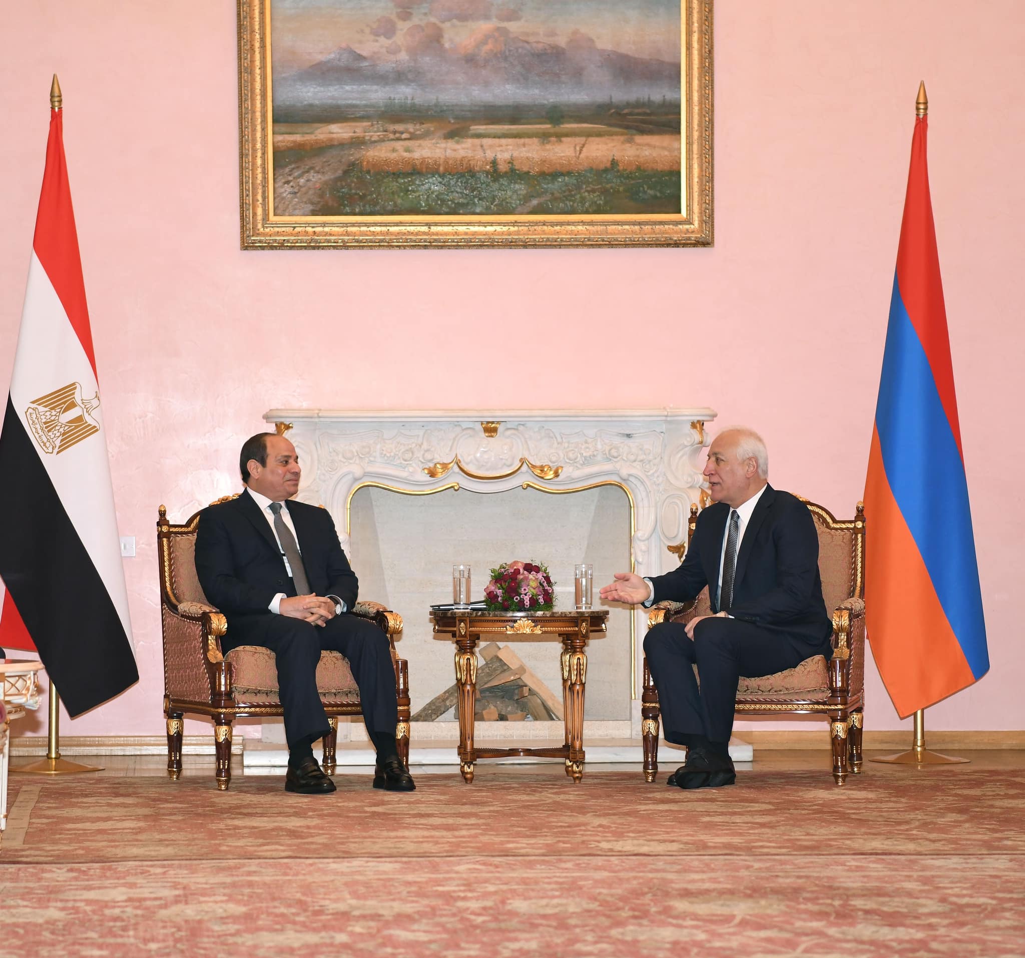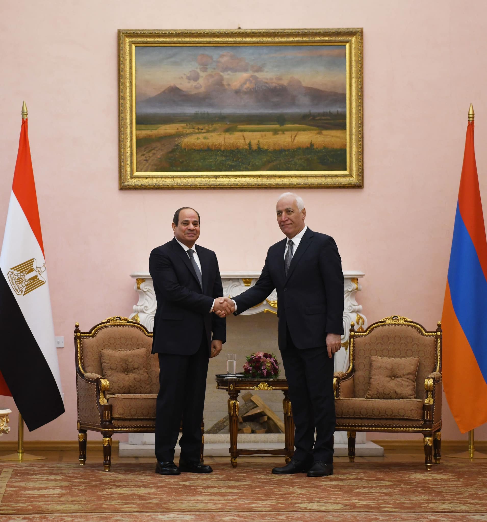 Msemaji rasmi wa Urais wa Jamhuri alisema kuwa Mheshimiwa Rais alifanya mazungumzo ya faragha na Rais wa Armenia, yakifuatiwa na kikao cha mazungumzo ya kina kilichojumuisha wajumbe wa nchi hizo mbili, ambapo Rais wa Armenia alikaribisha, mwanzoni mwake, ziara ya kihistoria ya Mheshimiwa Rais, akielezea Shukrani ya Armenia kwa Misri katika ngazi rasmi na maarufu, na kiburi chake kwa mahusiano ya muda mrefu kati ya nchi hizo mbili rafiki.