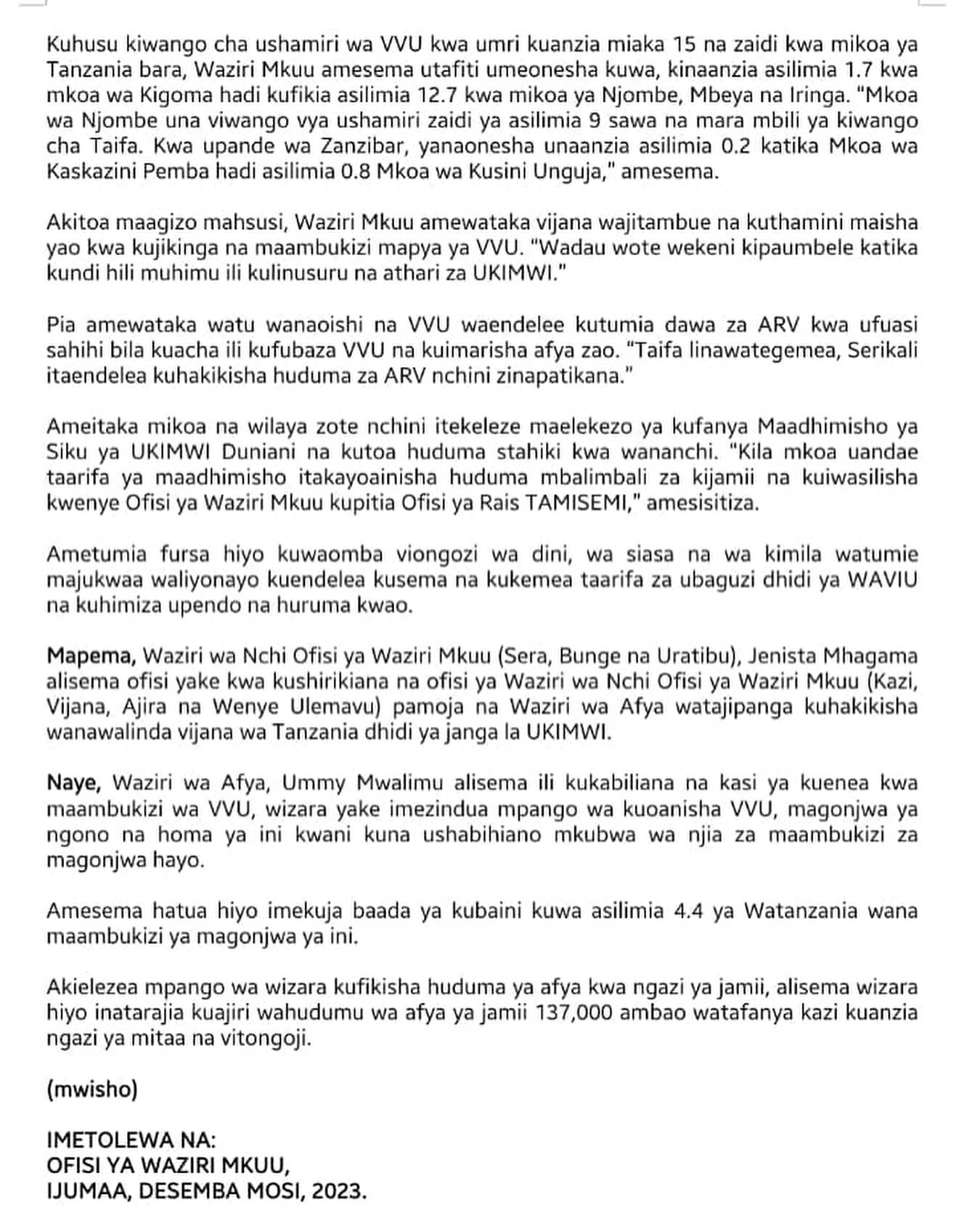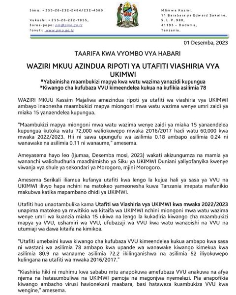 WAZIRI MKUU AZINDUA RIPOTI YA UTAFITI VIASHIRIA VYA UKIMWI